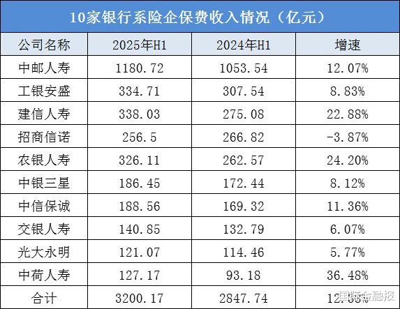 2025年上半年,10家银行系险企合计实现保险业务收入3200.17亿元,同比增长12.38%。与寿险业整体6.6%的增速相比,银行系险企表现更佳。