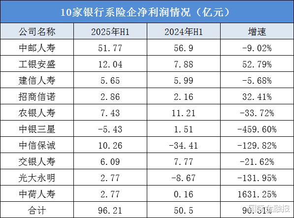 据《国际金融报》记者统计,2025年上半年,中邮人寿、工银安盛人寿、建信人寿、招商信诺人寿、农银人寿、中银三星人寿、中信保诚人寿、交银人寿、光大永明人寿和中荷人寿10家银行系险企共揽收保费3200.17亿元,同比增长12.38%;合计实现净利润96.21亿元,同比大增90.51%。